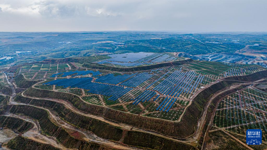 在内蒙古鄂尔多斯市准格尔旗准格尔召镇,当地利用一处煤矿复垦区建设了光伏发电场(无人机照片,2023年8月摄)。