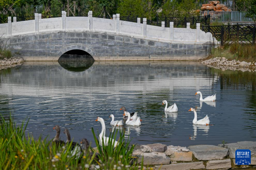 9月19日,在位于内蒙古鄂尔多斯市准格尔旗的国家能源集团准能集团矿山生态旅游区,一群鹅在水塘中游弋。