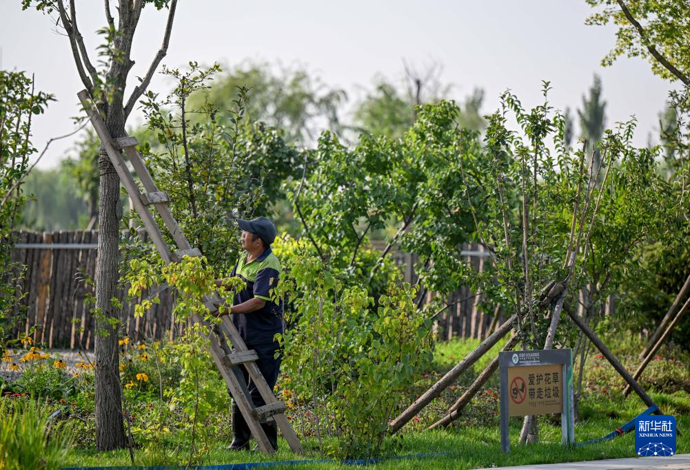 9月19日,在位于内蒙古鄂尔多斯市准格尔旗的国家能源集团准能集团矿山生态旅游区,工人在给树木剪枝。