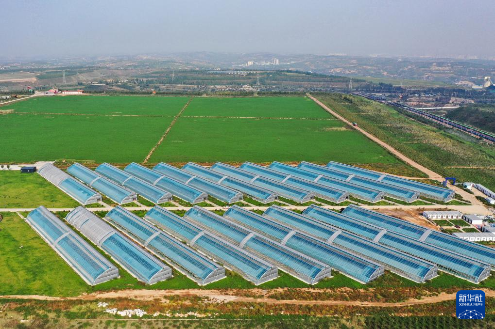 在位于内蒙古鄂尔多斯市准格尔旗的国家能源集团准能集团,煤矿复垦区上种植了苜蓿,盖起了蔬菜大棚(无人机照片,9月19日摄)。