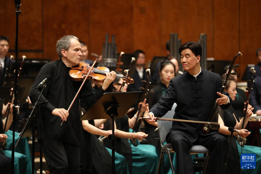 9月18日,在德国巴登-符滕堡州斯图加特音乐厅,德国小提琴演奏家乌尔里希·埃德尔曼(左)和中国二胡演奏家朱昌耀联袂演出中国经典曲目《梁祝》。