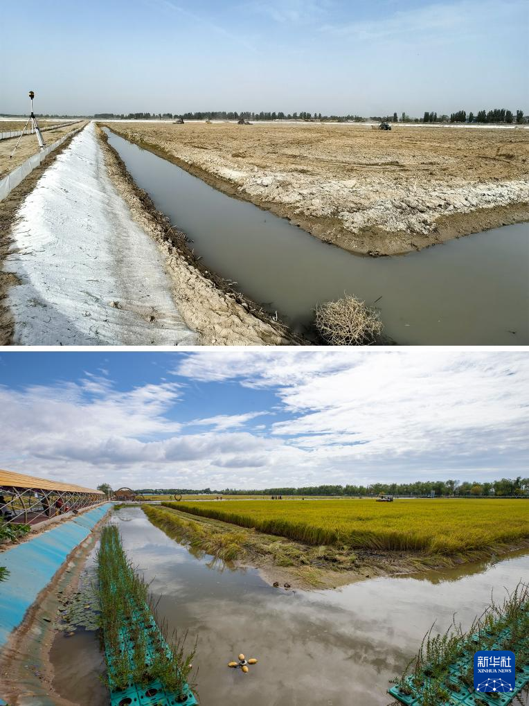 这是一张拼版照片。上图为2022年4月4日拍摄的宁夏农垦暖泉农场未经改良的盐碱化土地原貌(新华社发)。下图为北方民族大学杨国平教授通过微生物方式治理过的盐碱地上玉米的生长情况(9月21日摄,无人机照片,新华社记者杨植森摄)。