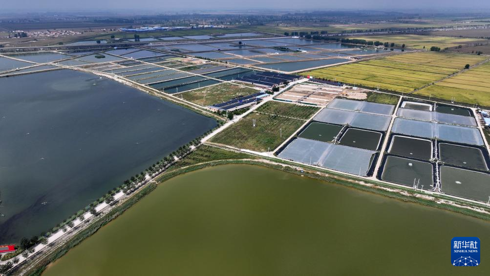 这是9月20日拍摄的宁夏银川市贺兰县立岗镇兰丰村的晶诚水产养殖基地(无人机照片)。昔日的盐碱地变为水产养殖的“聚宝盆”。