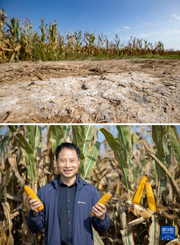 这是一张拼版照片:上图为2022年4月4日拍摄的宁夏农垦暖泉农场未经改良的盐碱化土地原貌(新华社发);下图为9月21日,北方民族大学杨国平教授在宁夏农垦暖泉农场展示盐碱地种出的玉米(新华社记者杨植森摄)。