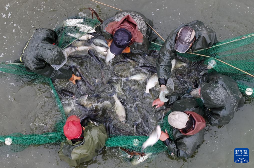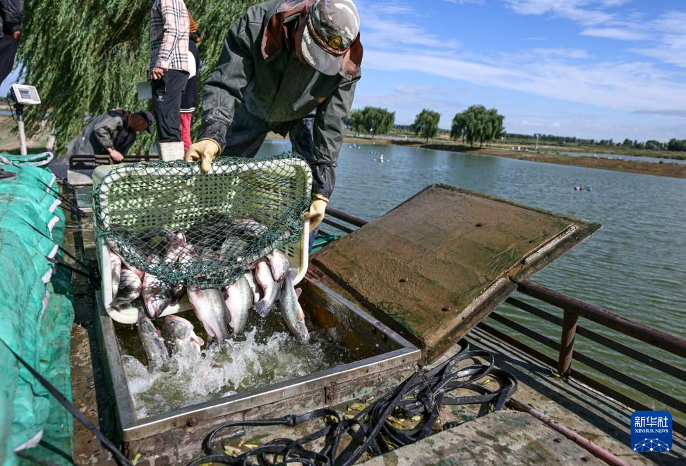 9月20日,工作人员在位于宁夏银川市贺兰县立岗镇兰丰村的晶诚水产养殖基地收获淡水鲈鱼。