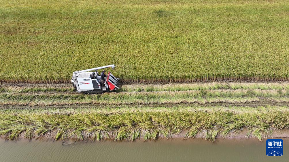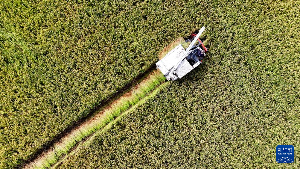 9月20日,农民在位于宁夏银川市贺兰县立岗镇永兴村的花田香蟹稻田主题公园收割水稻(无人机照片)。当地通过综合治理,将昔日荒芜、低产的盐碱地改良为稻蟹种养综合体。