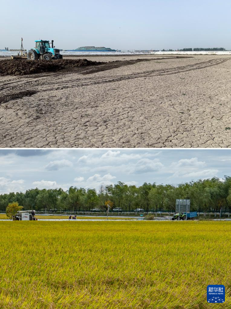 这是一张拼版照片:上图为2024年3月25日拍摄的位于宁夏银川市贺兰县立岗镇永兴村的花田香蟹稻田主题公园建设现场(新华社发);下图为2024年9月20日拍摄的立岗镇永兴村的花田香蟹稻田主题公园(新华社记者杨植森摄)。