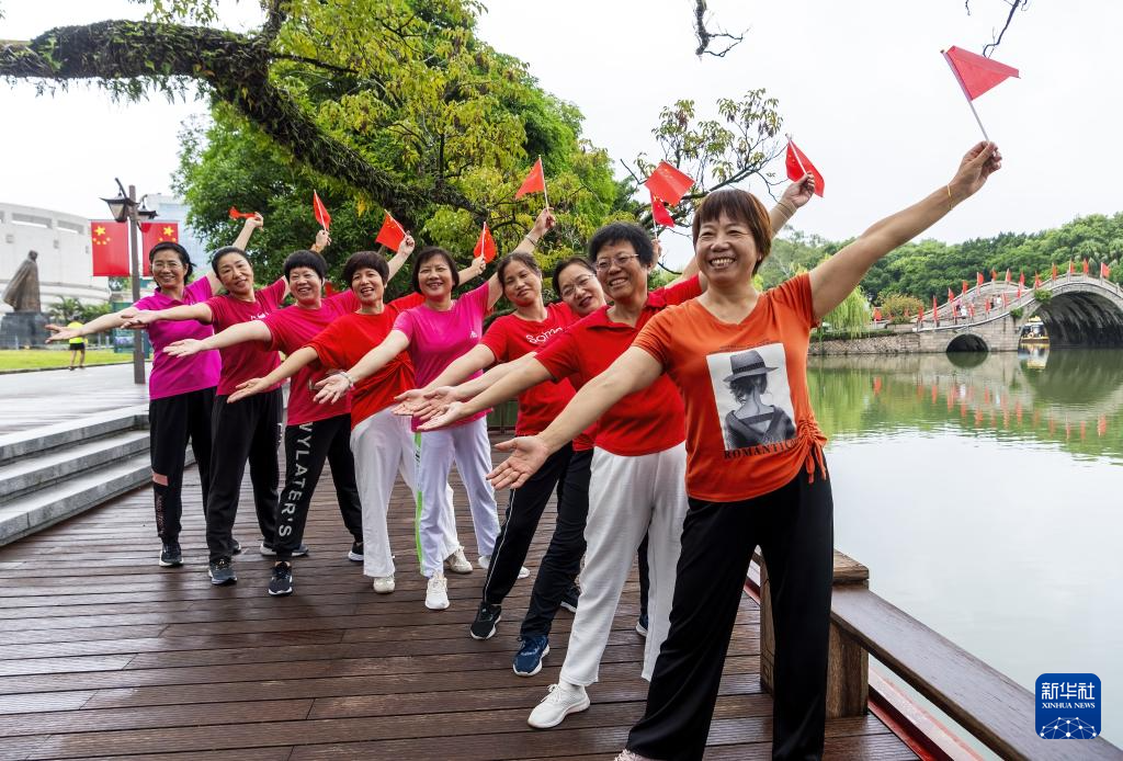 10月1日,晨练爱好者在福建博物院广场上手持国旗合影。