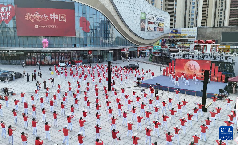 10月1日,江苏省连云港市海州区吾悦广场,健身爱好者进行健身操集体会操表演(无人机照片)。