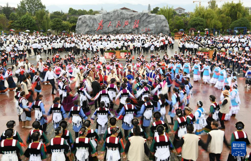 10月1日,在云南省丽江市玉龙纳西族自治县,各族群众在升国旗仪式后进行民族团结打跳活动。