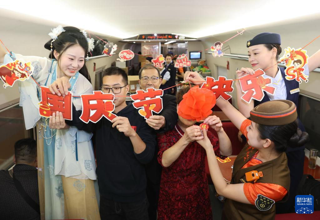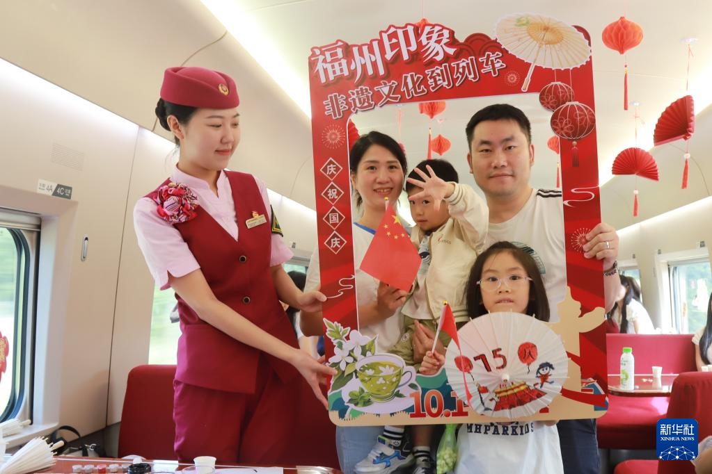 10月1日,在平潭开往上海虹桥的G1634次列车上,工作人员与乘客在“非遗课堂”上共度国庆。