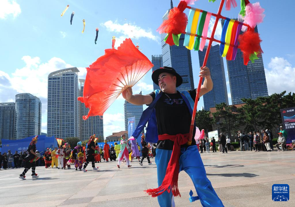10月1日,民间艺人在山东省烟台市芝罘区滨海广场进行民俗表演。