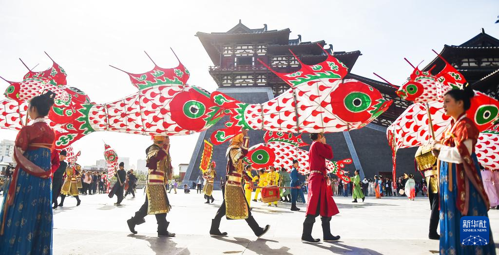 10月1日,在河南省洛阳市隋唐洛阳城国家遗址公园应天门景区,艺人表演鱼灯民俗巡游。