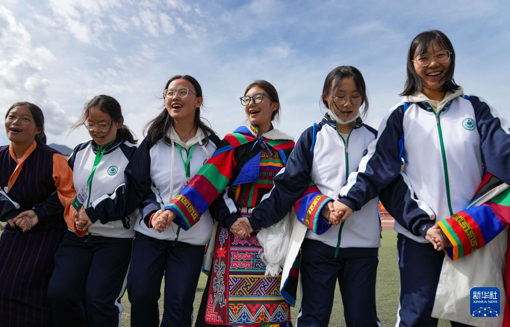 10月1日,河北衡水中学师生访问拉萨阿里河北完全中学,在学校田径运动会开幕式上和当地同学一起跳锅庄。
