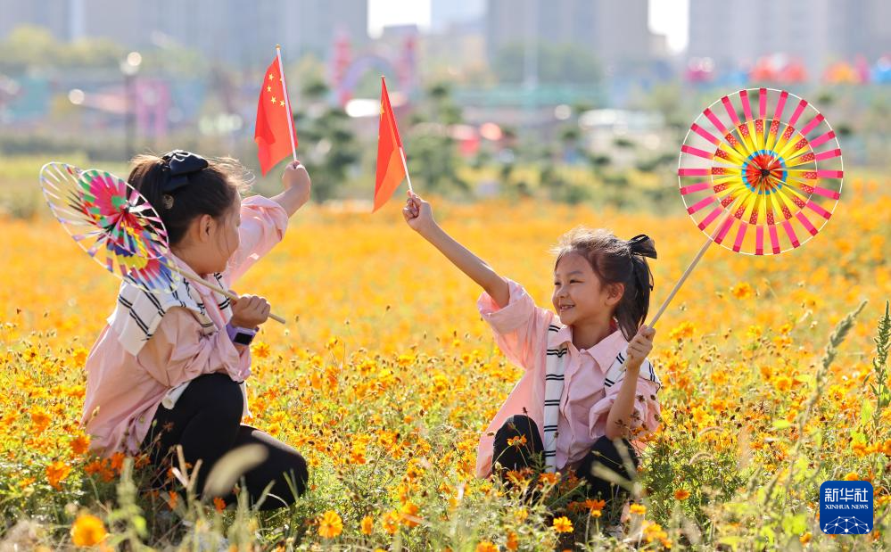 10月1日,小朋友在山东省枣庄市东湖公园游玩。