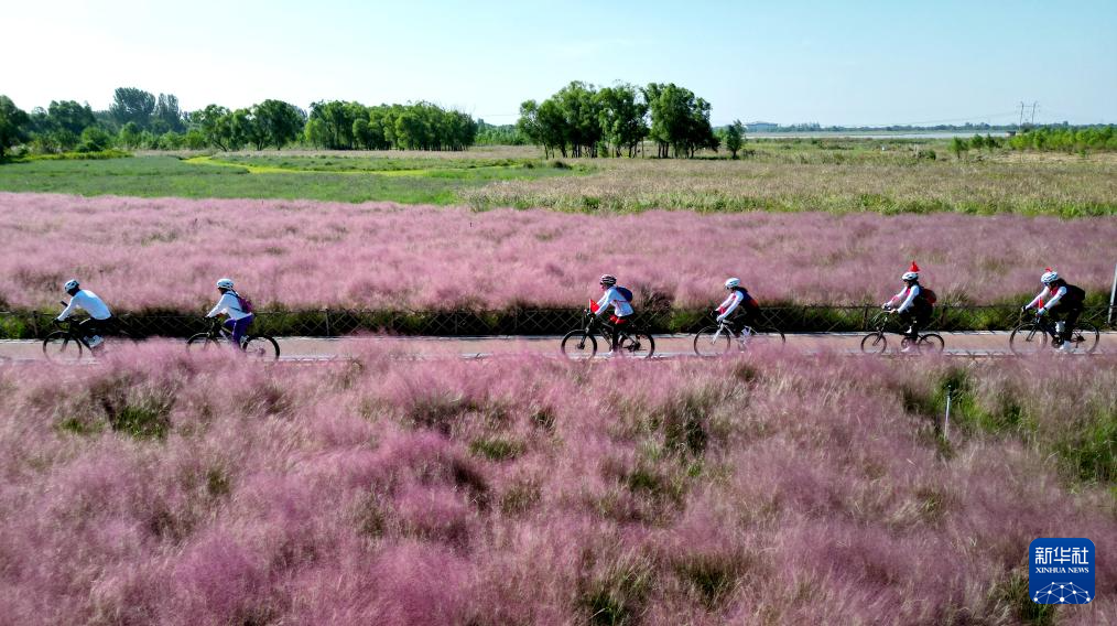 10月1日,骑行爱好者在山东省东营市东营区耿井湿地粉黛乱子草区骑行。