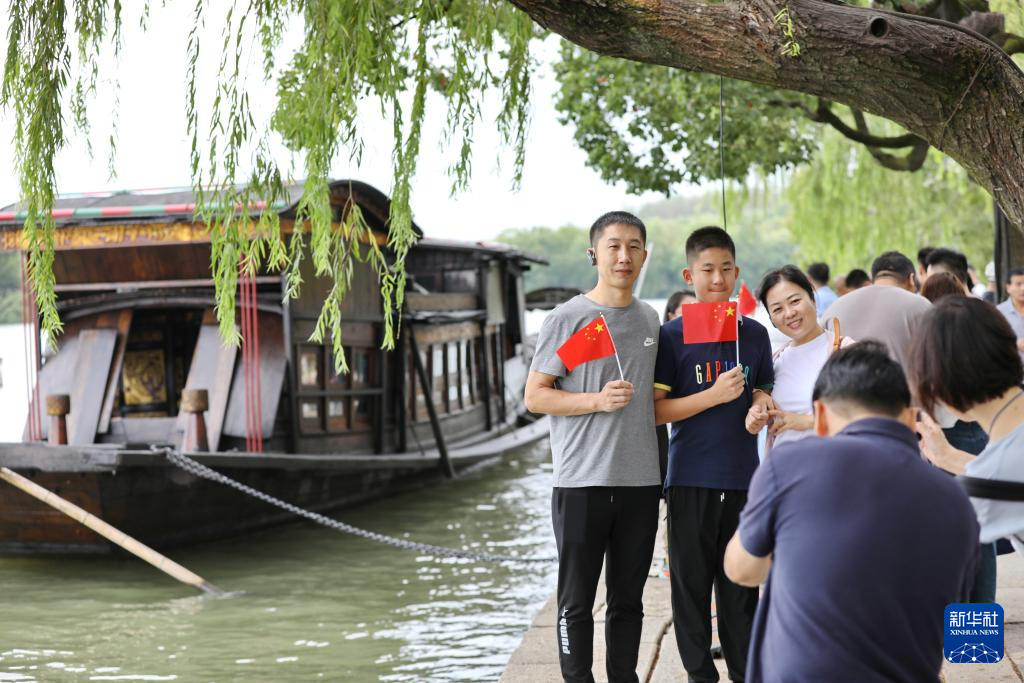 10月1日,市民在浙江省嘉兴市南湖景区参加游园活动。