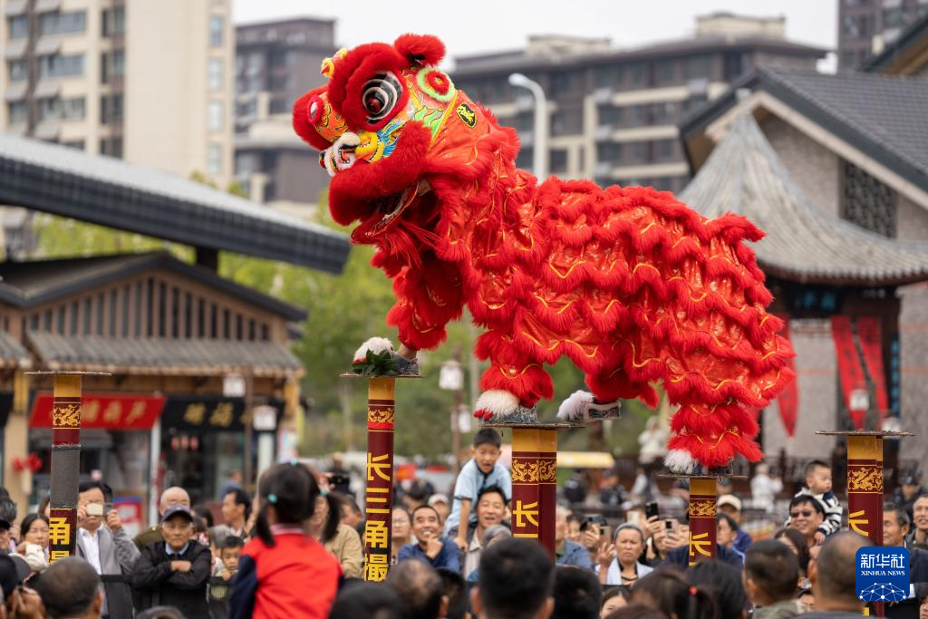 10月1日,游客在安徽省合肥市肥东县撮街观看高桩狮表演。