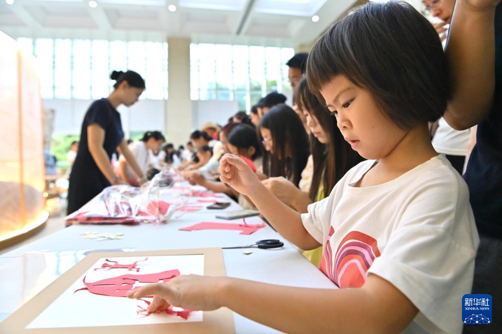 10月1日,小朋友在广西壮族自治区博物馆学习剪纸技艺。