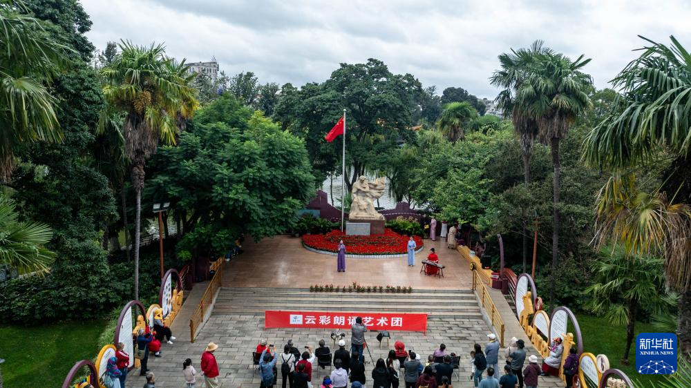 10月1日,人们在云南省昆明市翠湖公园聂耳广场观看演出(无人机照片)。