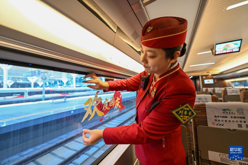 10月1日,京津城际列车工作人员为京津城际列车车厢装饰国庆元素贴画。