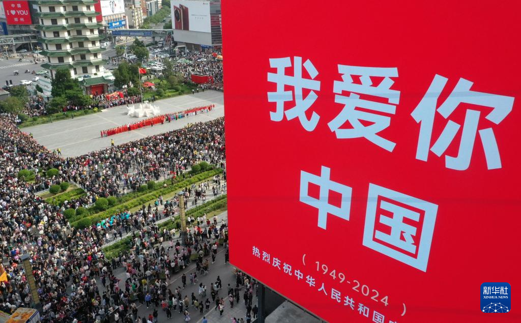 10月1日,人们在河南省郑州市二七广场观看升旗仪式后的演出(无人机照片)。