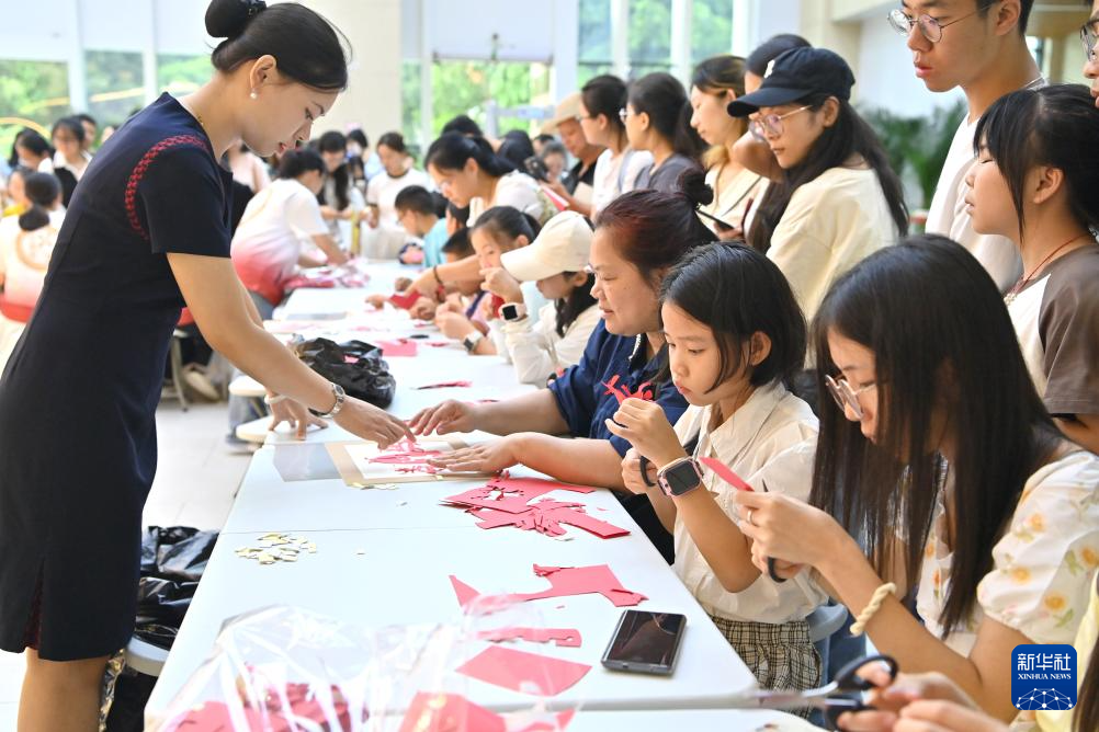 10月1日,工作人员在广西壮族自治区博物馆指导市民学习剪纸技艺。