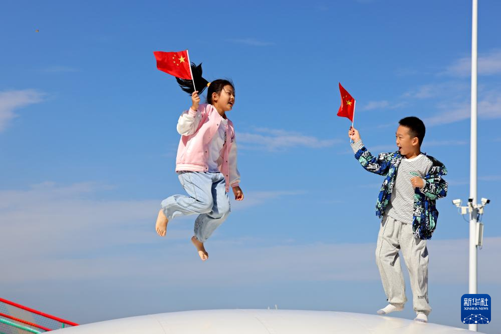 10月1日,在山东省枣庄市东湖公园,小朋友在“弹力球”上跳跃。