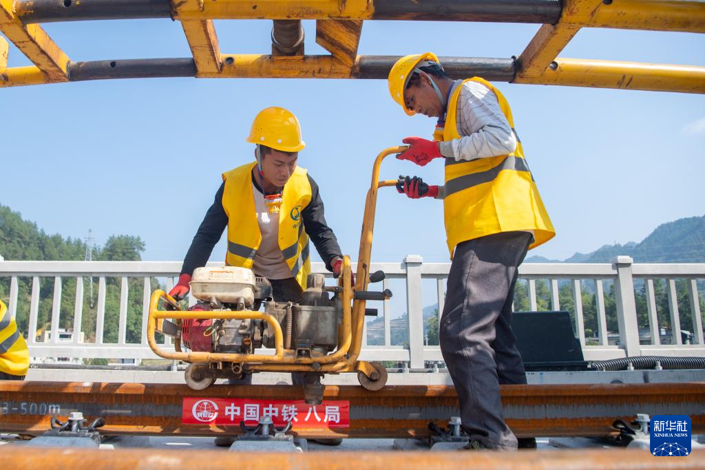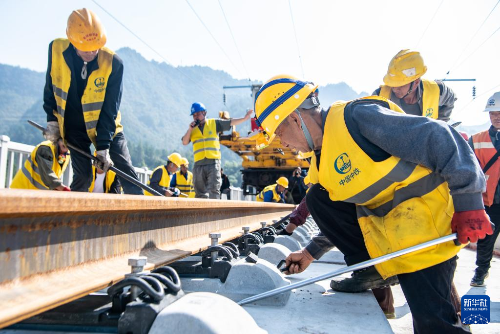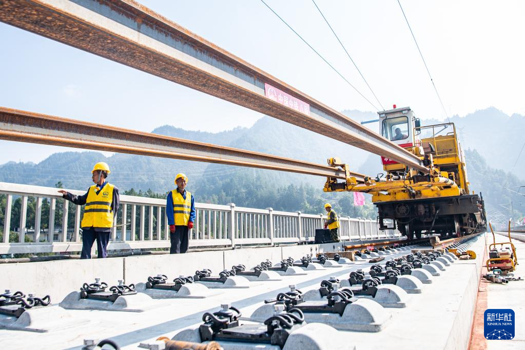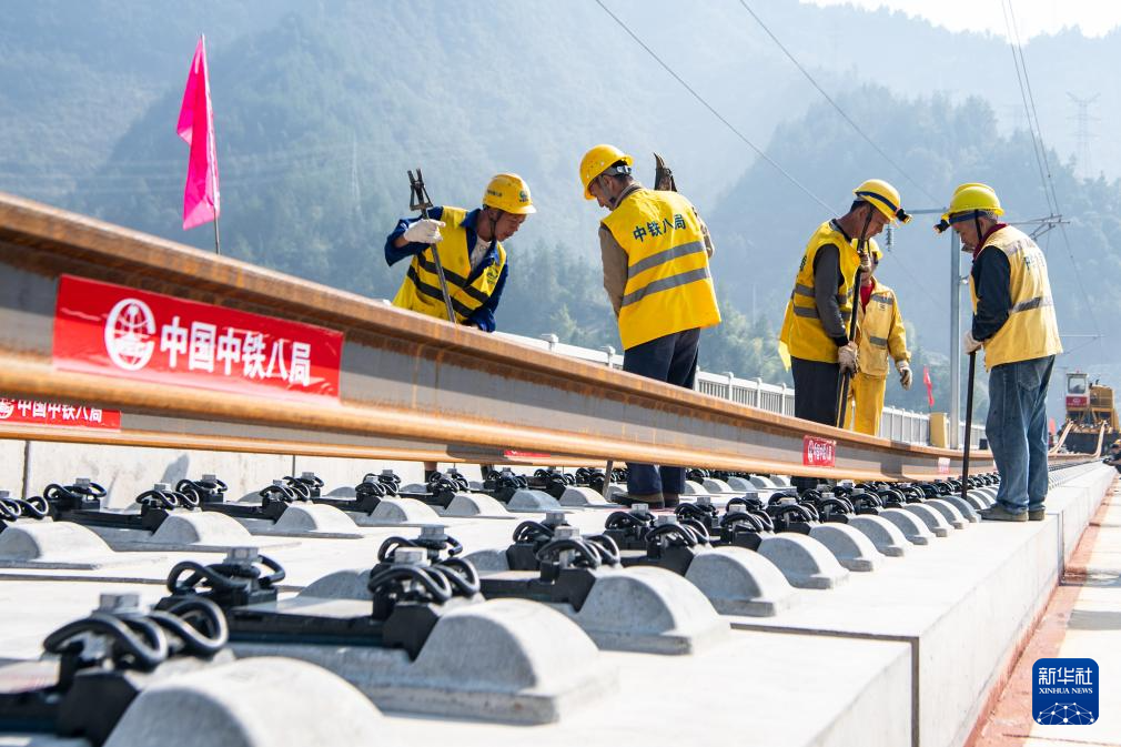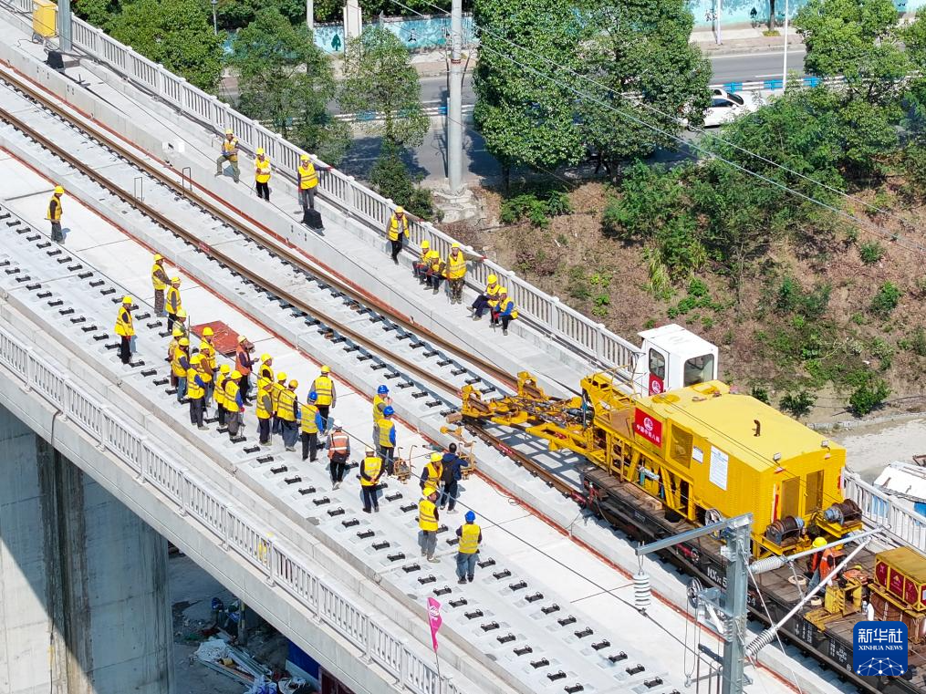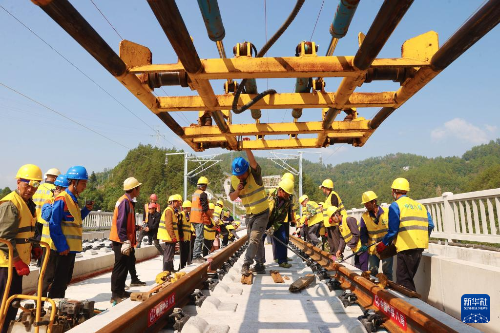 10月9日,工人在渝厦高铁重庆东至黔江段施工现场铺设轨道。