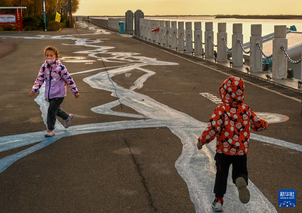 10月11日,在同江三江口生态旅游区,两名儿童在沿江大道上玩耍。