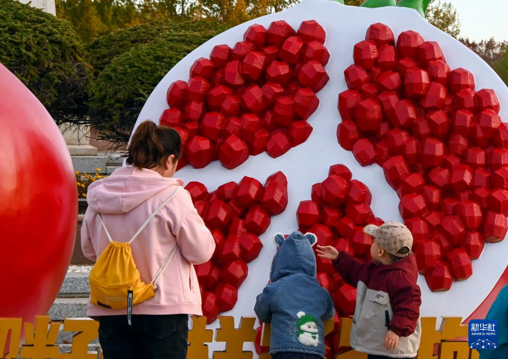 10月11日,在同江三江口生态旅游区,游客在石榴籽雕塑前准备拍照。
