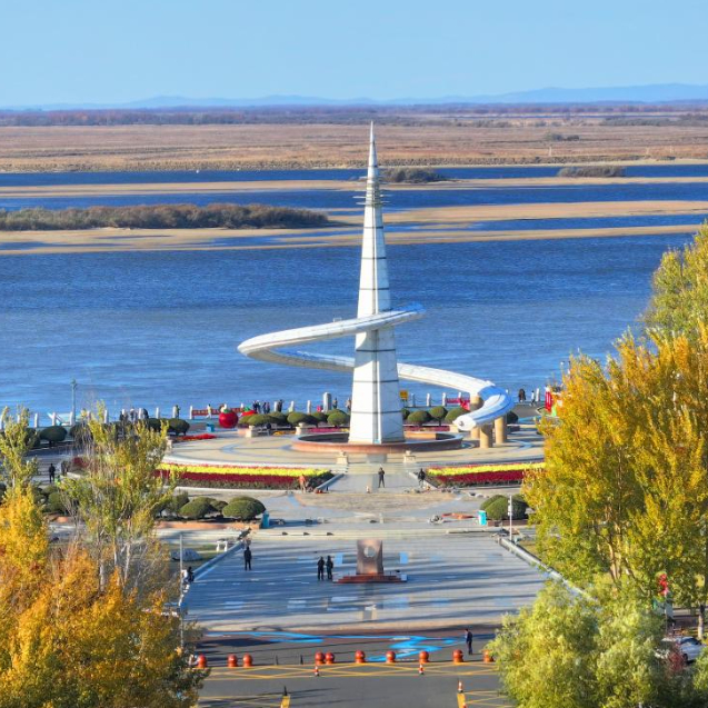 这是10月11日拍摄的同江三江口生态旅游区同三公路标志塔(无人机照片)。