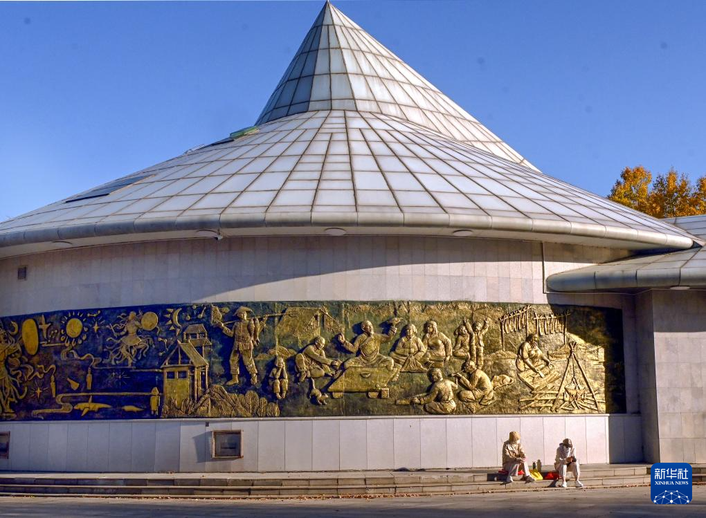 10月11日,两位游客在同江三江口生态旅游区的同江市博物馆外小憩。