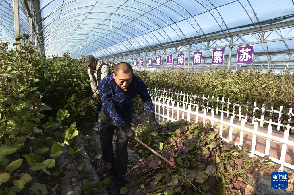 10月12日,在桦南县紫苏种植实验基地的塑料大棚内,工人在收割紫苏。