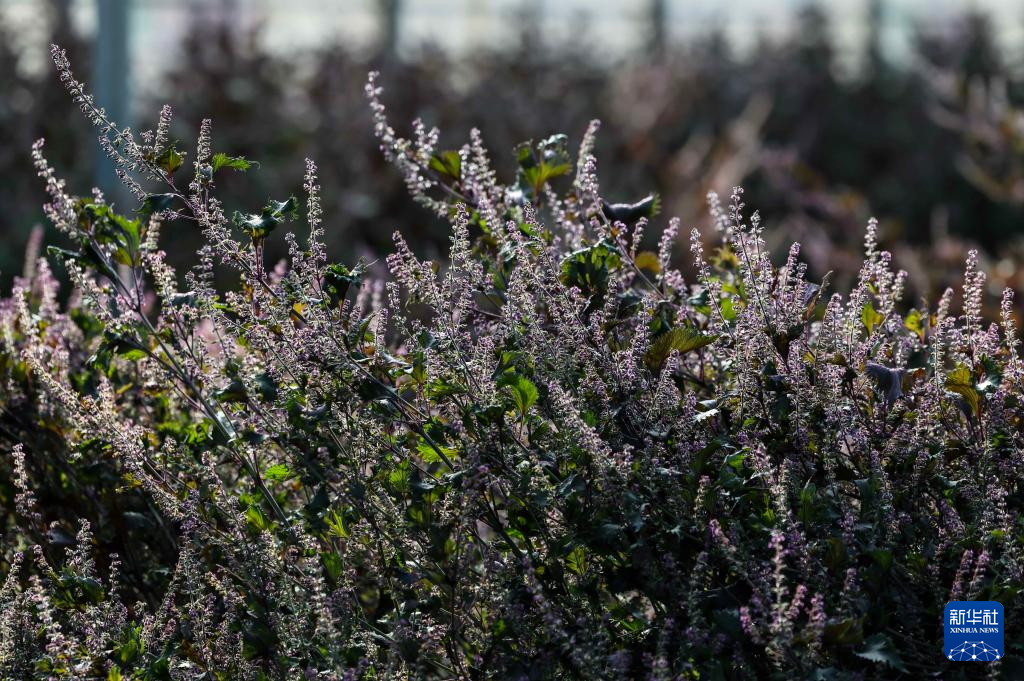 这是10月12日在桦南县紫苏种植实验基地的塑料大棚内拍摄的紫苏。