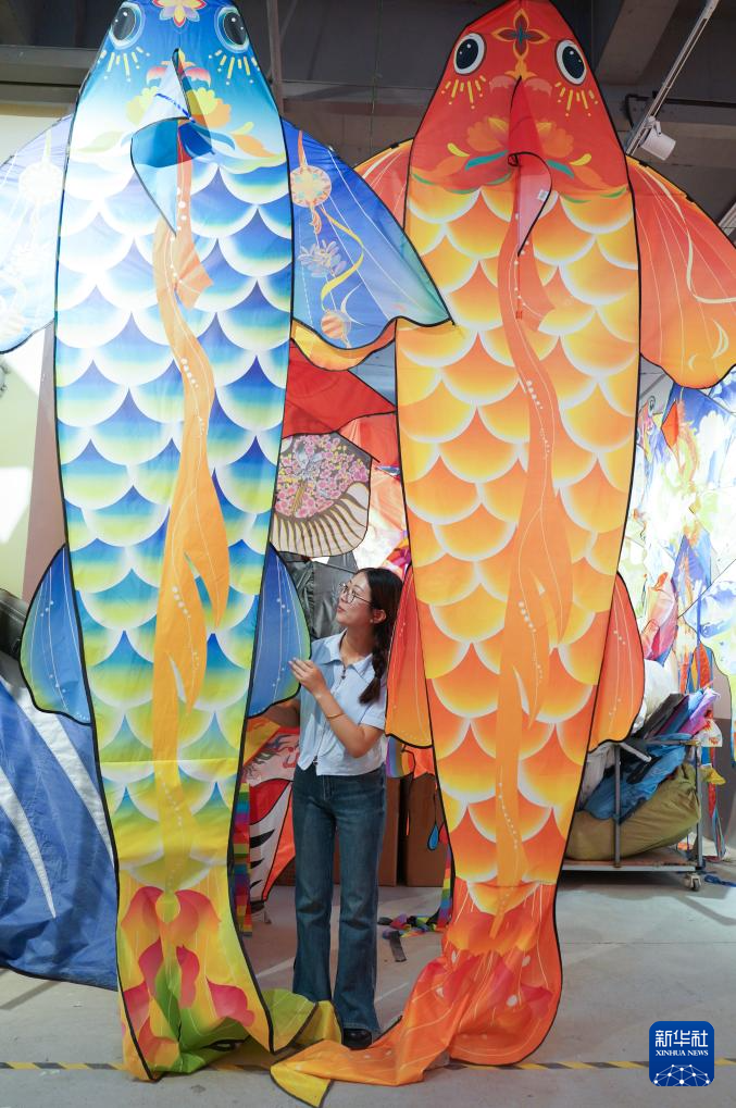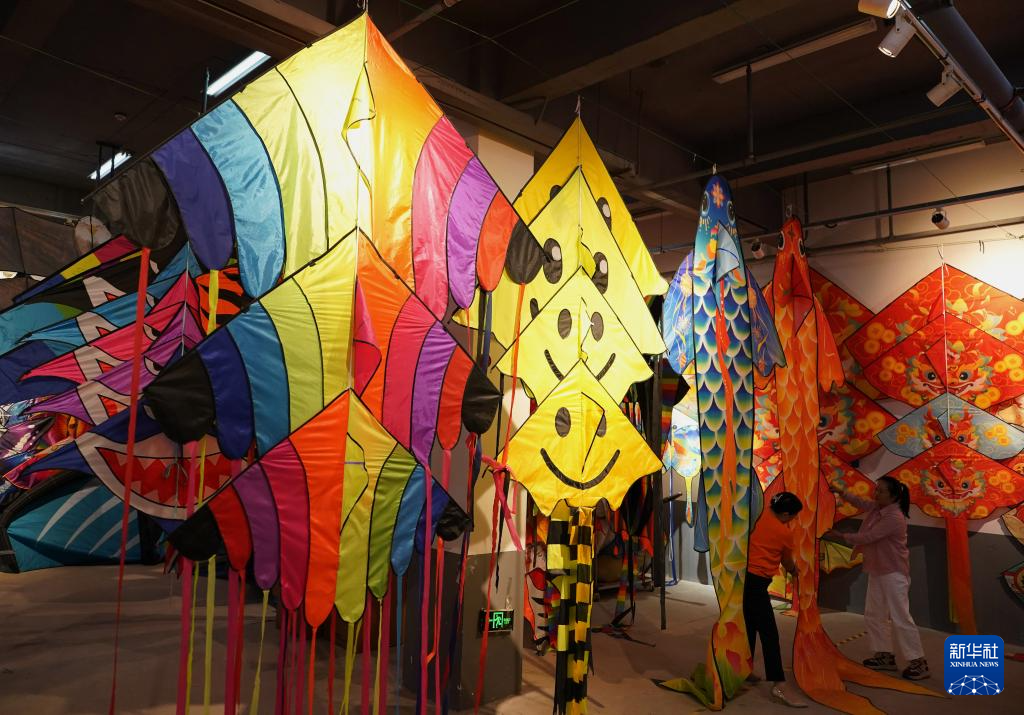 10月14日,在山东省潍坊市寒亭区的一家风筝生产企业,工作人员在展示风筝样品。
