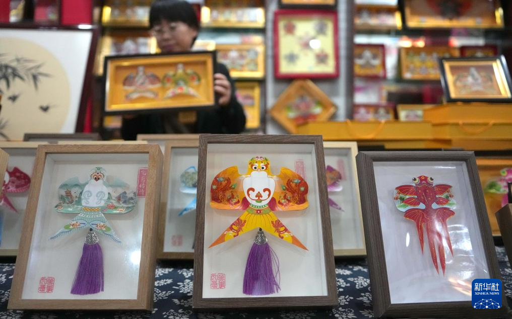 10月14日,在山东省潍坊市寒亭区,一家风筝作坊展示的风筝文创产品。