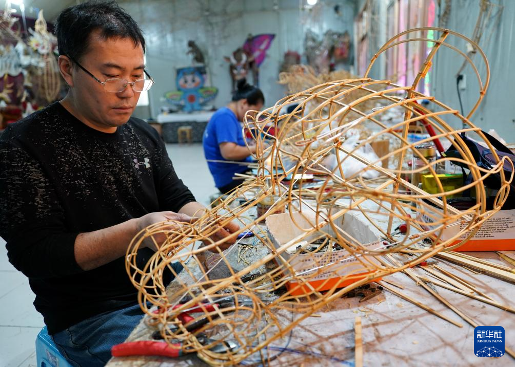 10月14日,在山东省潍坊市寒亭区的一家风筝作坊,工作人员在制作风筝。