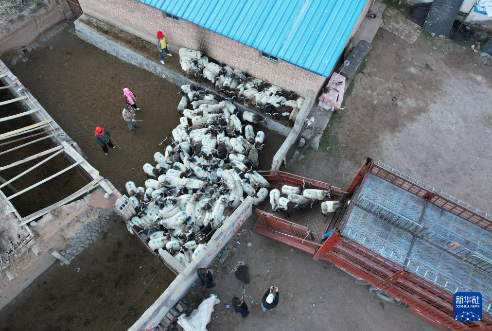 10月15日,肃南裕固族自治县康乐镇隆丰村的牧民将羊群赶往运输车上,准备运往临泽县的异地借牧点(无人机照片)。