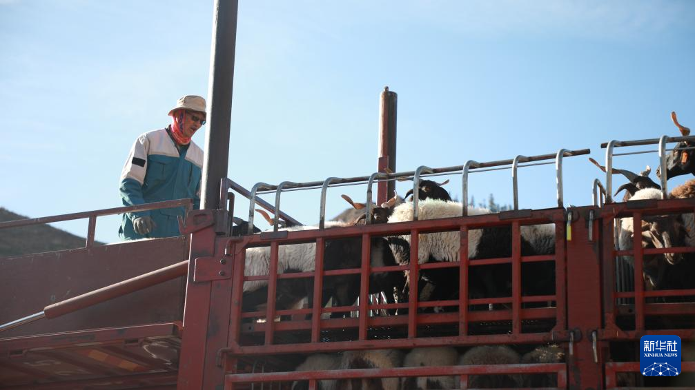 10月15日,在肃南裕固族自治县,卡车司机贾正兴将羊群装车,准备运往临泽县的异地借牧点。