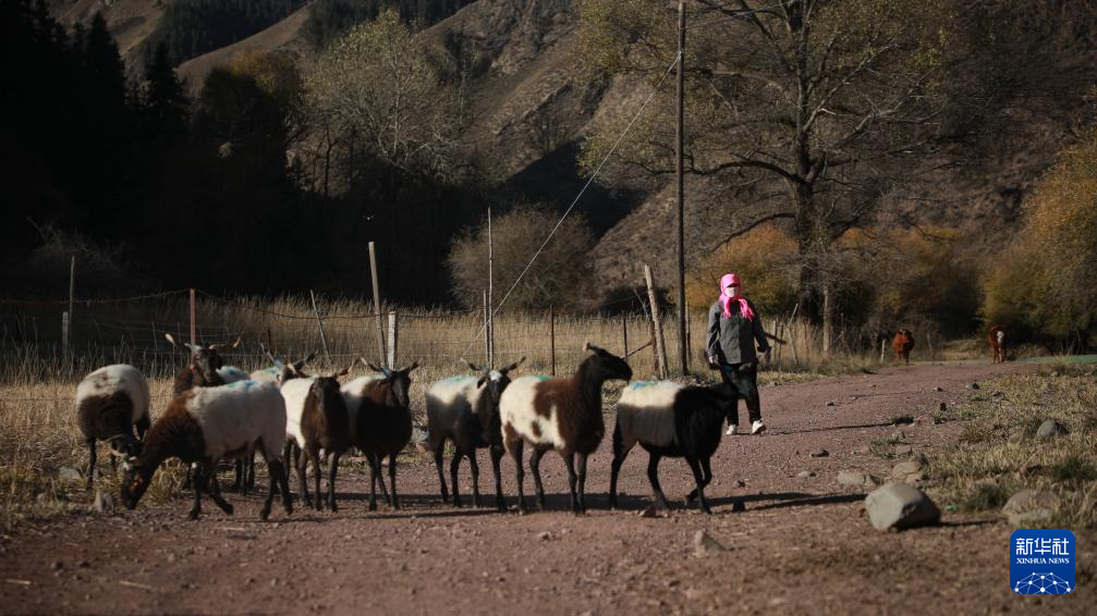 10月15日,肃南裕固族自治县康乐镇隆丰村的牧民在驱赶羊群。