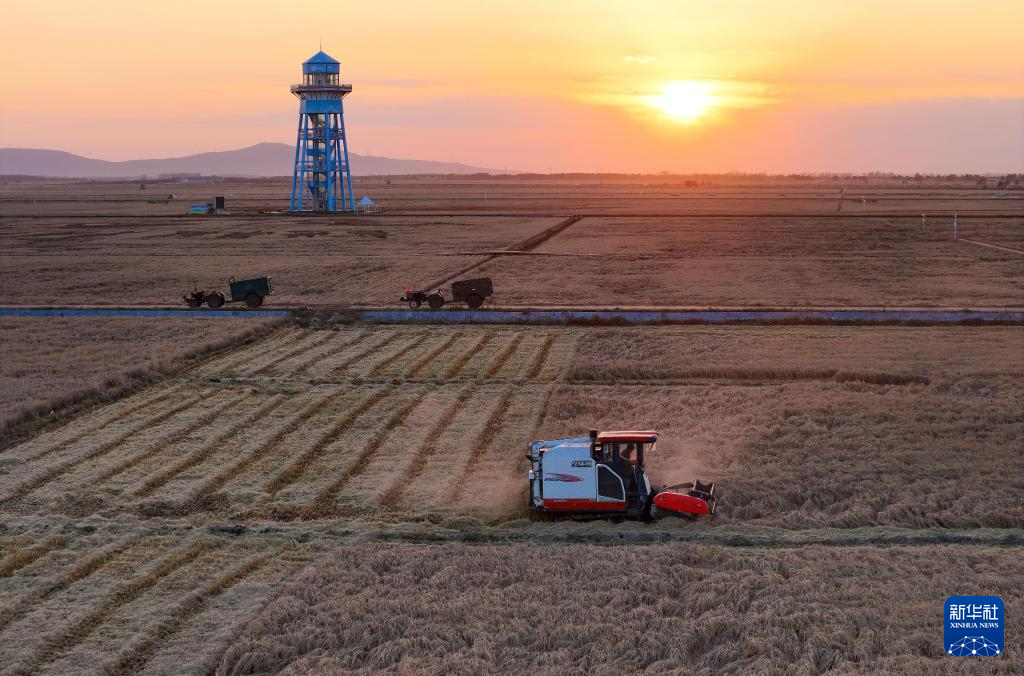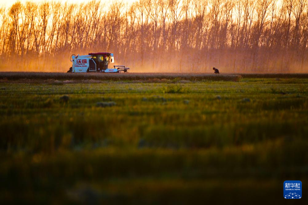 10月11日,在黑龙江省佳木斯抚远市玖成水稻种植专业合作社的稻田,农机在夕阳下作业。