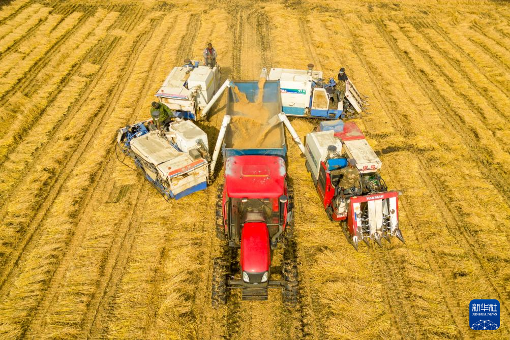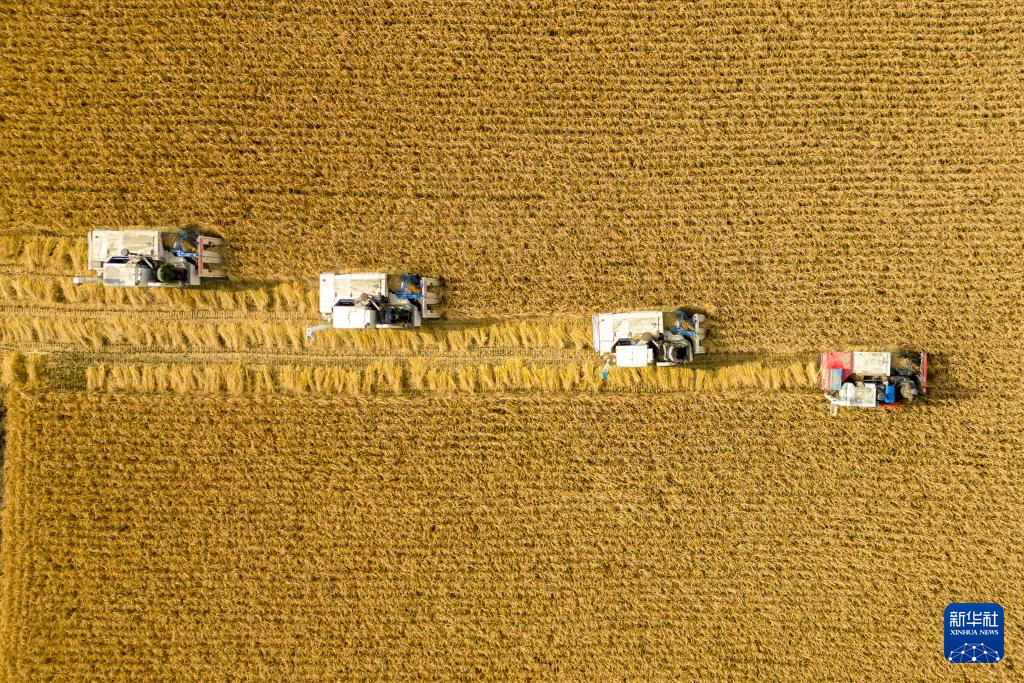 9月22日,农机在黑龙江省重要粮食产区哈尔滨市方正县的稻田中进行收割作业。