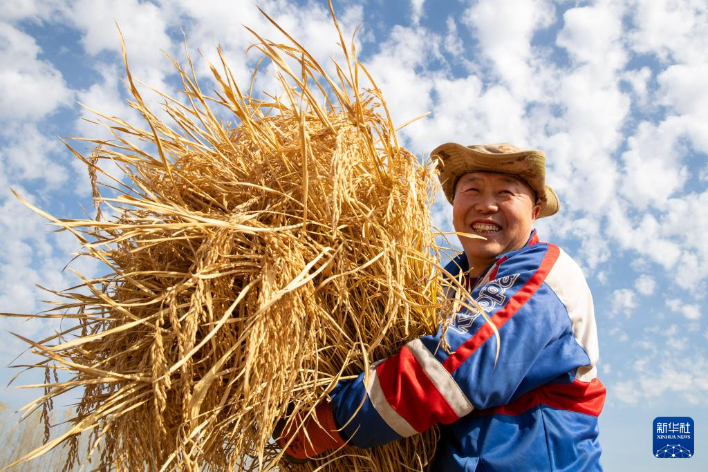 10月13日,在绥化市北林区双河镇稻香村,村民抱着刚刚收割的水稻。