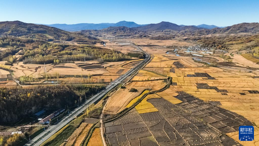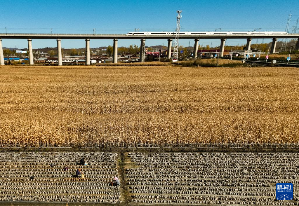 10月11日,在黑龙江省尚志市亚布力镇,农民在高铁旁的田间劳作(无人机照片)。