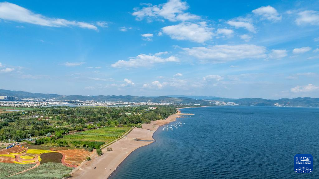 抚仙湖在蓝天白云的映衬下显得格外美丽(无人机照片,9月20日摄)。