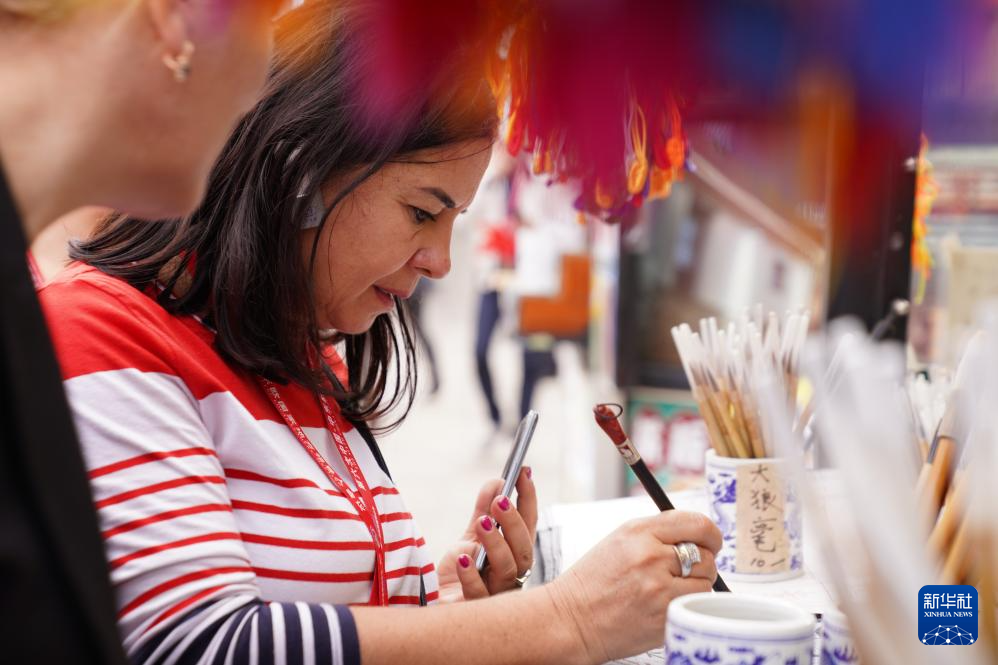10月17日,外国游客在山东烟台所城里历史文化街区体验毛笔书法。