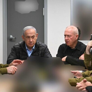 这张10月26日发布的照片显示,在对伊朗袭击期间,以色列总理内塔尼亚胡(中左)、国防部长加兰特(中右)以及国防军高级指挥人员坐在位于特拉维夫的国防军总部内。
