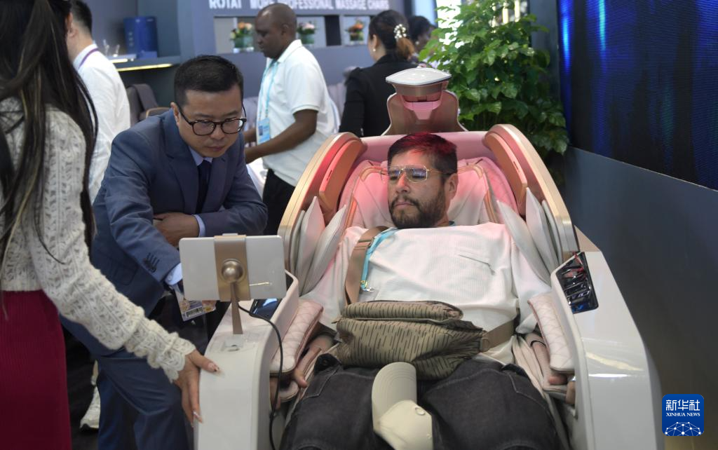 10月31日,客商在广交会上体验按摩椅。