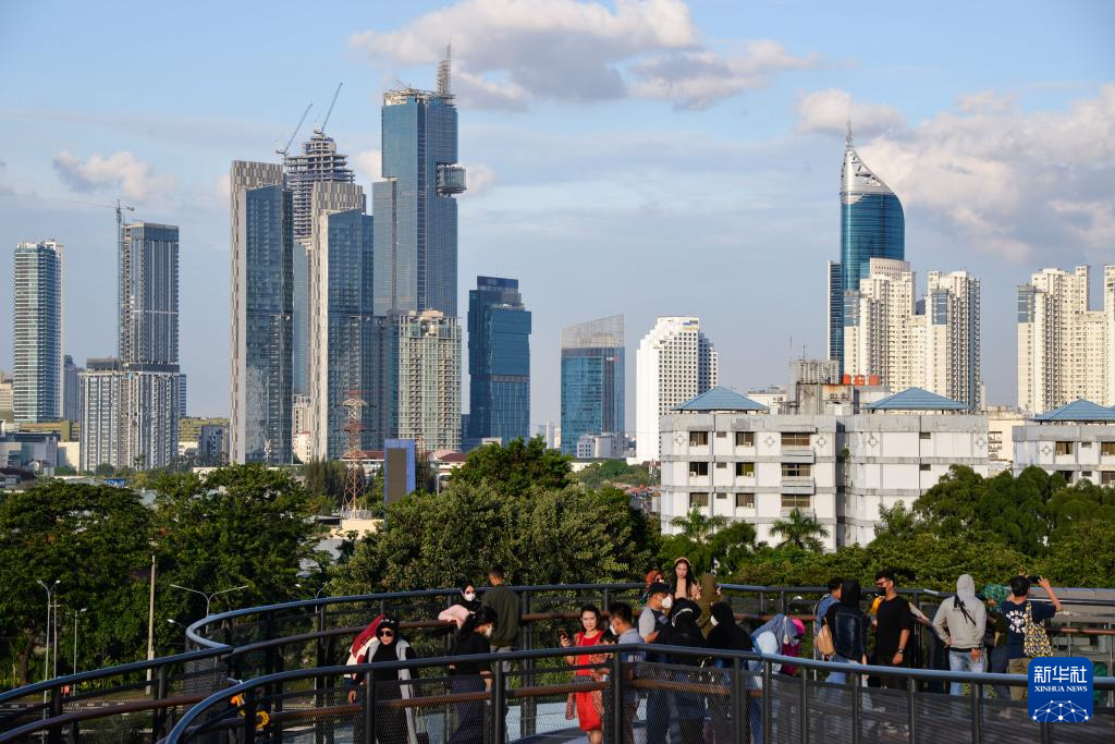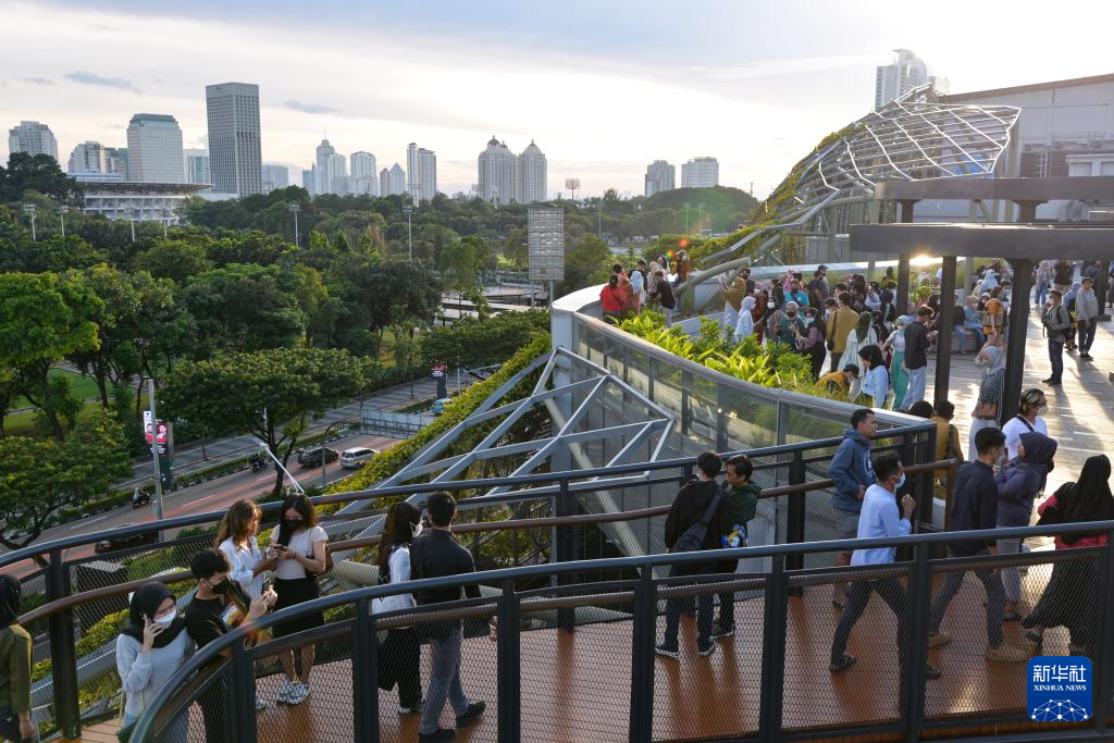 2022年1月23日,人们在印度尼西亚雅加达史纳延公园的空中步道欣赏城市风光。